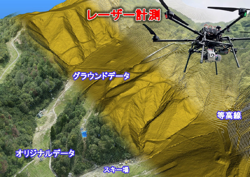 昨年8月の豪雨により大規模なのり面崩壊が各所で発生した滋賀県内のスキー場では、冬期シーズンに向けた早急な対策工事の必要に迫られました。このため、UAVを用いたレーザー計測による崩壊のり面の3次元データの取得と対策検討に必要な平面図並びに縦横断図の作成を提案し、現地で実施した地質調査の結果も踏まえ、崩壊原因の推定と対策工法の検討に短期間で資することができました。