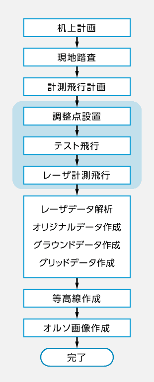 様々な角度から撮影した複数の写真をもとに解析を行い、求められた地形の3次元データに基づいて等高線図の作成や縦横断面の計測を行います。